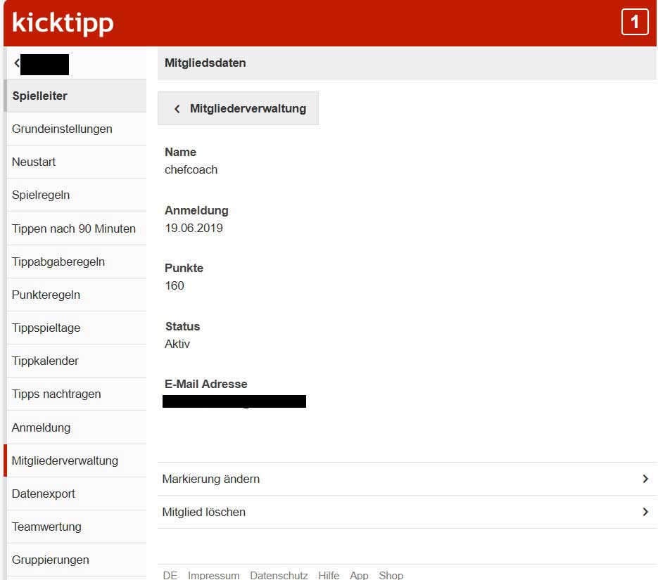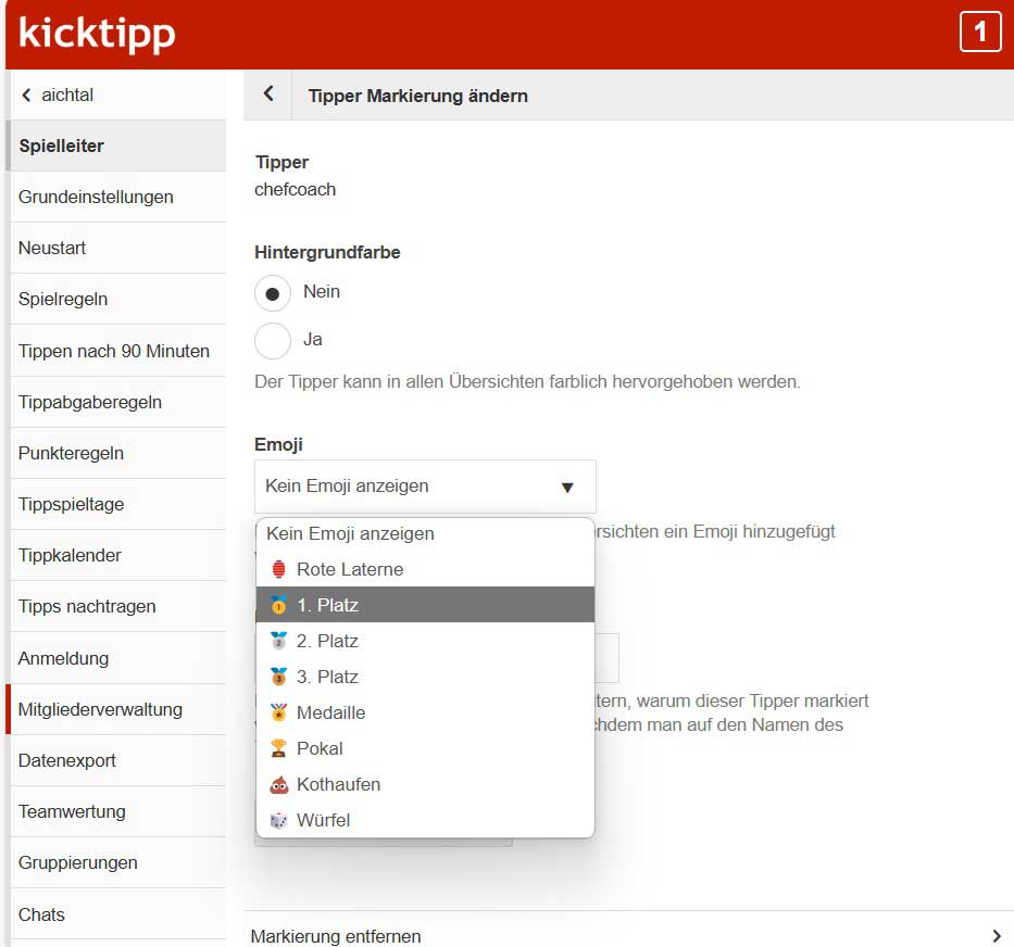 Einstellen kann dies nur der Spielleiter. Dazu wählt er im Spielleiter-Menü den Punkt Mitgliederverwaltung, wählt dann den entsprechenden Tipper aus, und klickt auf Markierung ändern. Dann wählt ihr das entsprechende Emoji und speichert die Einstellung ab. Achtet darauf, dass ihr die aktuelle Saison ausgewählt habt, damit ihr nicht die Emojis in der vergangenen Saison hinzufügt. Das passiert insbesondere dann schnell, wenn man das Archiv der Tipprunde öffnet um nachzusehen, wer die vorderen Plätze belegt hat.
